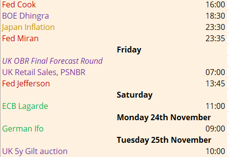 1. The UKThere is still one more forecast round to come from the OBR ahead of the Budget itself on Wednesday 26 November, meaning that there is a further interminable wait until Friday 21 November to assess whether the politically more palatable “smorgasbord” approach without income tax hikes really does mean the Chancellor meets her fiscal rules. If not, then …