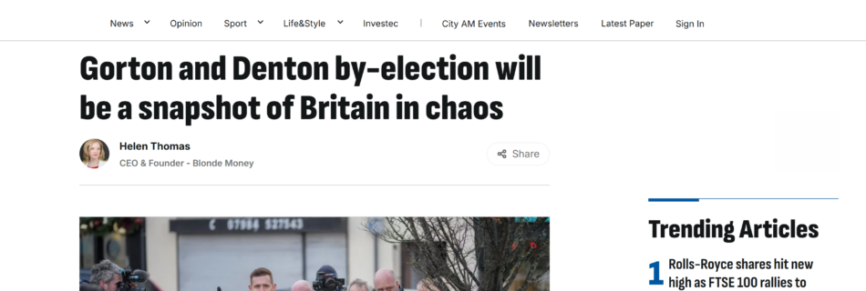 A week today we should know the result of the pivotal Gorton and Denton by-election. Here is an article in City AM published on 6th February 2026 which explains the backdrop, reproduced with kind permission of the editor: Gorton and Denton by-election will be a snapshot of Britain in chaos The upcoming Gorton and Denton …