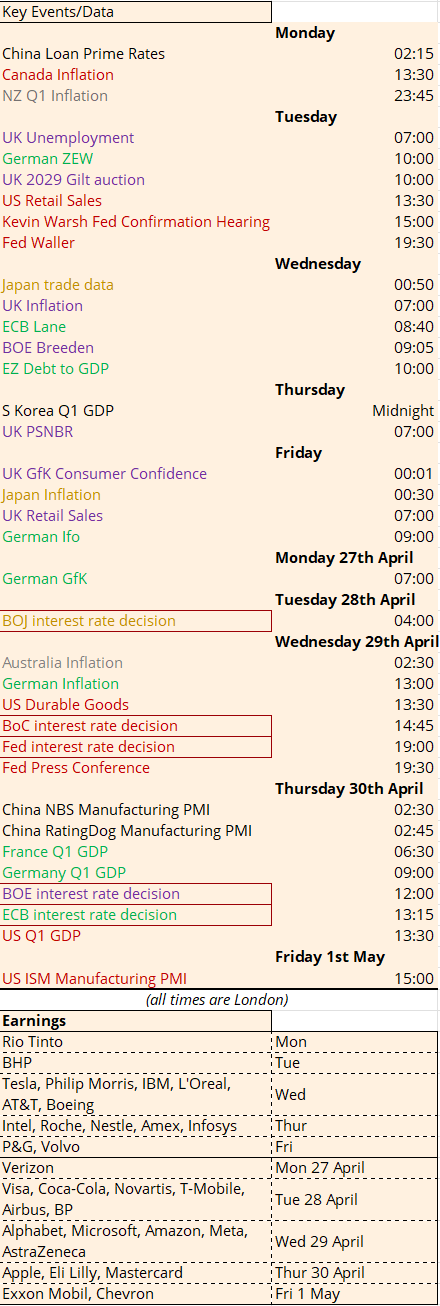 We are in a world where the politics very much trumps, pun intended, the economics. The Fed on Wednesday 29th April will also remain on hold. This will be Jerome Powell’s last meeting as Chair (assuming his replacement has been confirmed by the end of Powell’s term on 15th May) so his comments will be less relevant than what we hear from Kevin Warsh at his confirmation hearing on Tuesday. With a market that anticipates Warsh will be dovish come what may, there is the potential for a hawkish surprise in his responses to Senate Banking Committee questions. Having already gone through one nomination process to become a Fed Governor along with his role in George W Bush’s National Economic Council and countless other political positions, Warsh knows how to play the political game.