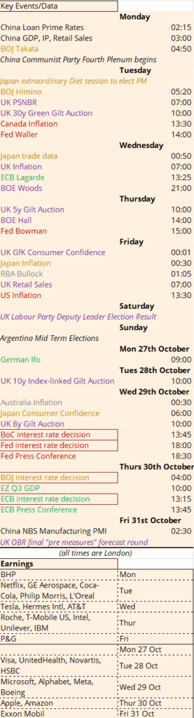 How Rachel Reeves must hope she could keep her head down until the Budget. She keeps saying that she will make the “numbers add up” but she doesn’t even know what number she needs to find yet. That changes on Friday 31st October when the OBR deliver their final “pre-measures” forecast to the Treasury. Such stock is put on the OBR’s model that debate rages over whether they have already taken their snapshot of market parameters, thus ensuring the biggest weekly drop in 10y Gilt yields since April would not have been counted, making Reeves’ task even harder.